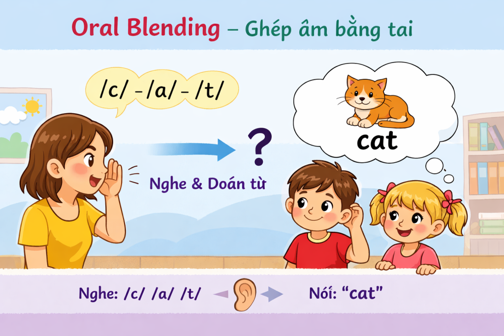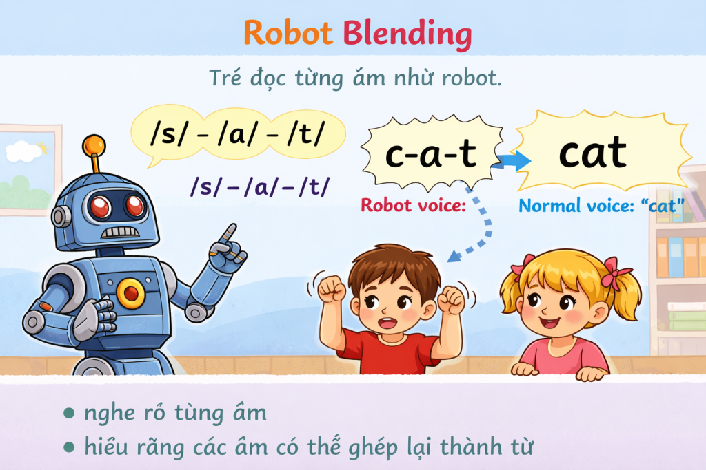 Blending là kỹ năng ghép các âm (sounds) lại với nhau để đọc thành một từ.